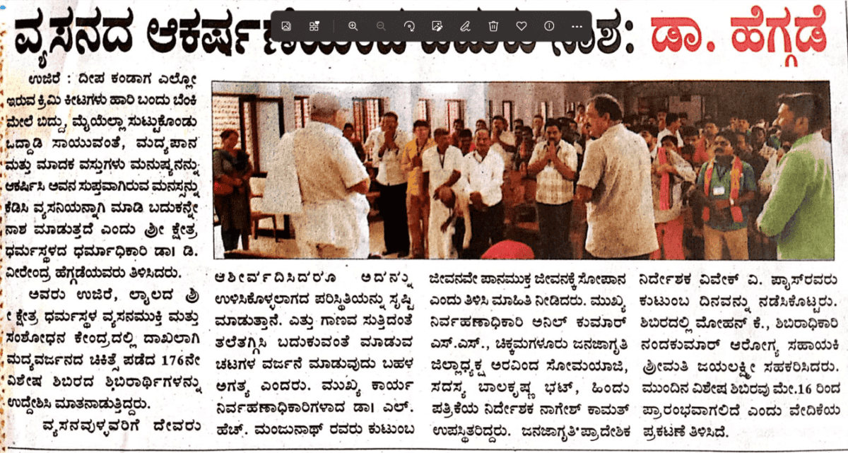 ವ್ಯಸನದ ಆಕರ್ಷಣೆಯಿಂದ ಬದುಕು ನಾಶ: ಡಾ|| ಹೆಗ್ಗಡೆ