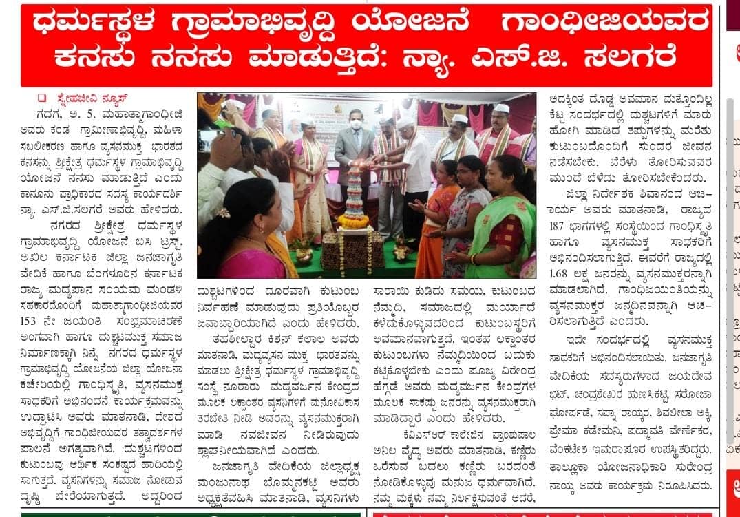 ಧರ್ಮಸ್ಥಳ ಗ್ರಾಮಾಭಿವೃದ್ದಿ ಸಂಘದಿಂದ ಗಾಂಧಿ ಜಯಂತಿ ಆಚರಣೆ ಹಾಗೂ ಜಾಗ್ರತಿ ಅಭಿಯಾನ