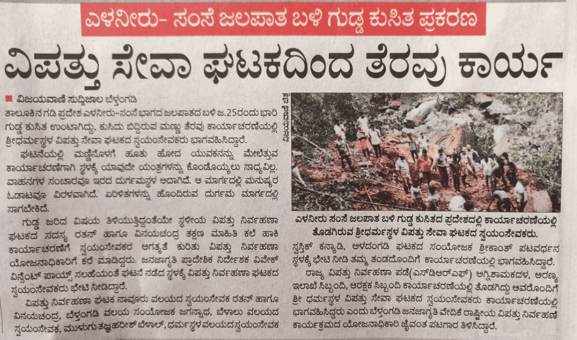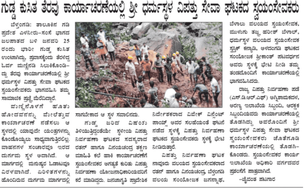 ಗುಡ್ಡ ಕುಸಿತ ತೆರವು ಕಾರ್ಯಾಚರಣೆಯಲ್ಲಿ ಧರ್ಮಸ್ಥಳ ವಿಪತ್ತು ಸೇವಾ ಘಟಕದ ಸ್ವಯಂ ಸೇವಕರ ನೆರವು