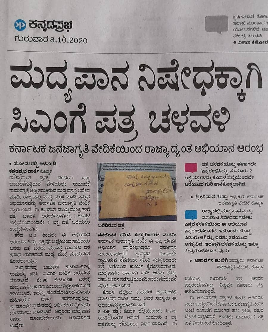 ಮದ್ಯಪಾನ ನಿಷೇಧಕ್ಕಾಗಿ ಸಿ.ಎಂ ಗೆ ಪತ್ರ ಚಳುವಳಿ