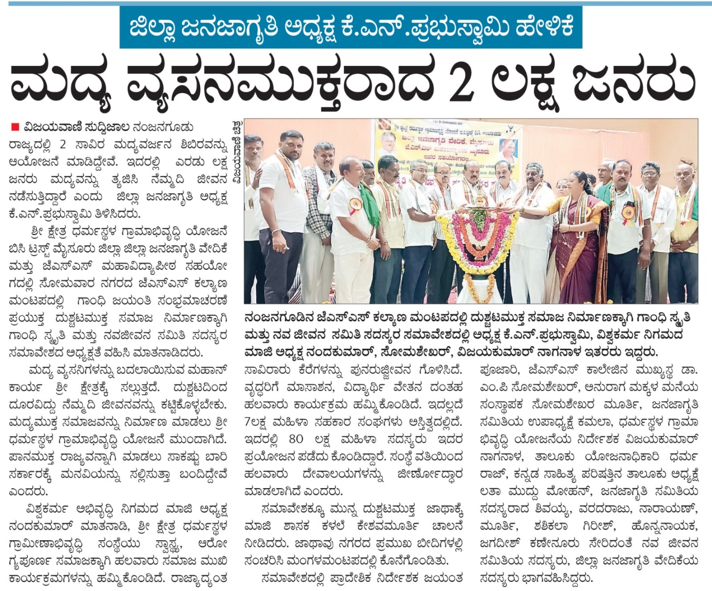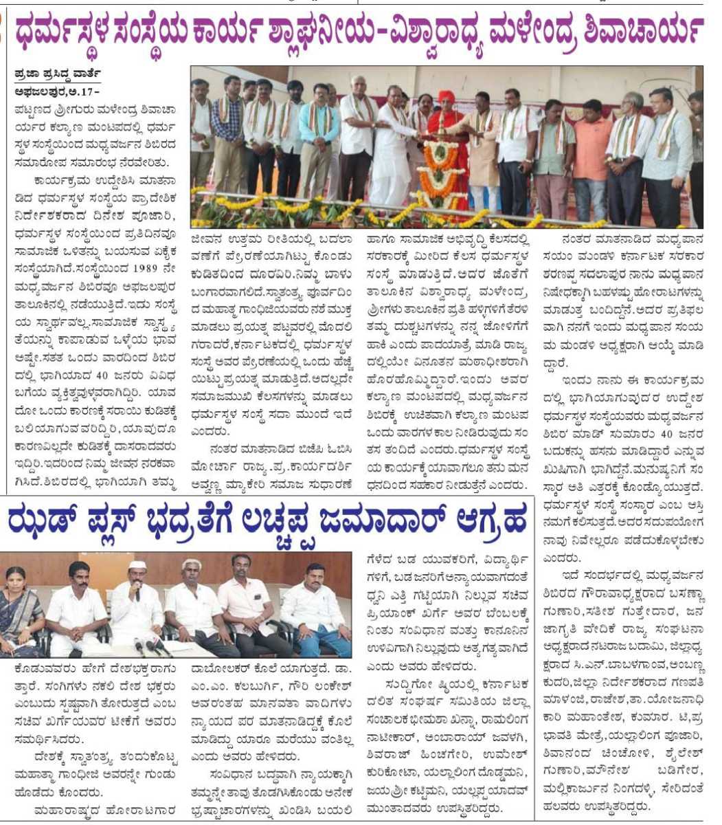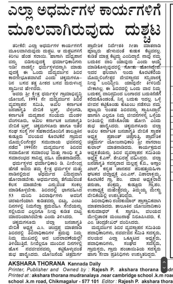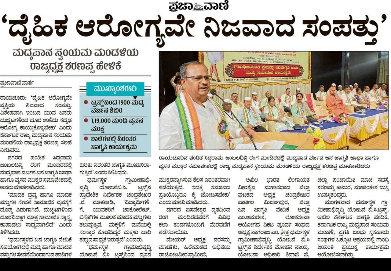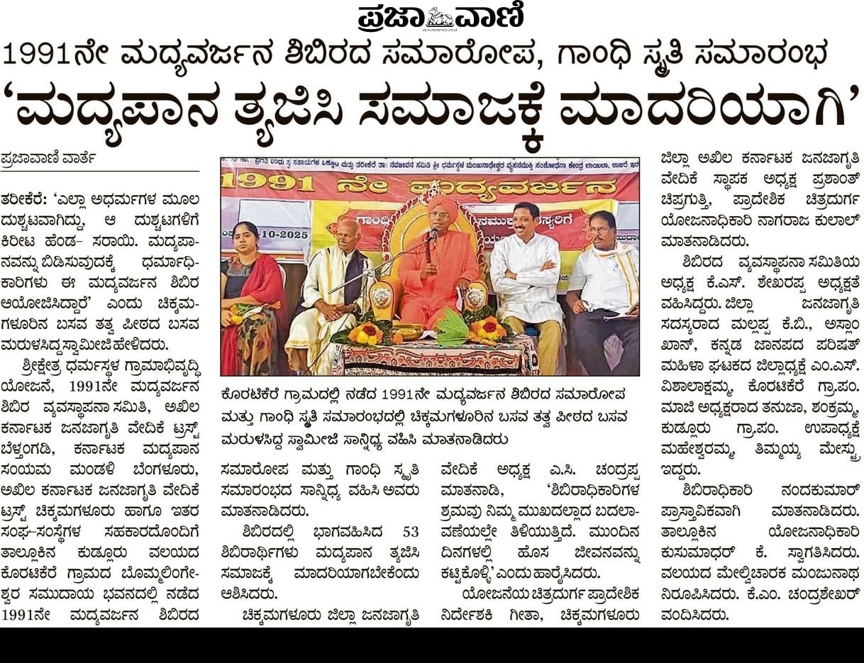 Iam very glad that Janajagruthi Vedike is successfully completing 25 years. It is a sign of progress that this Forum started in 1991 to eradicate bad habits like addiction to liquor has spread throughout the state. Many people joined hands for this purpose and that is how the Forum could achieve this. The path that the Forum has trodden is hard.
