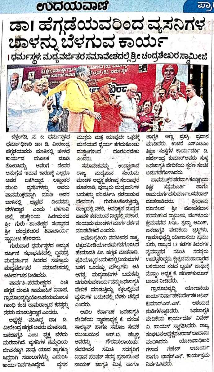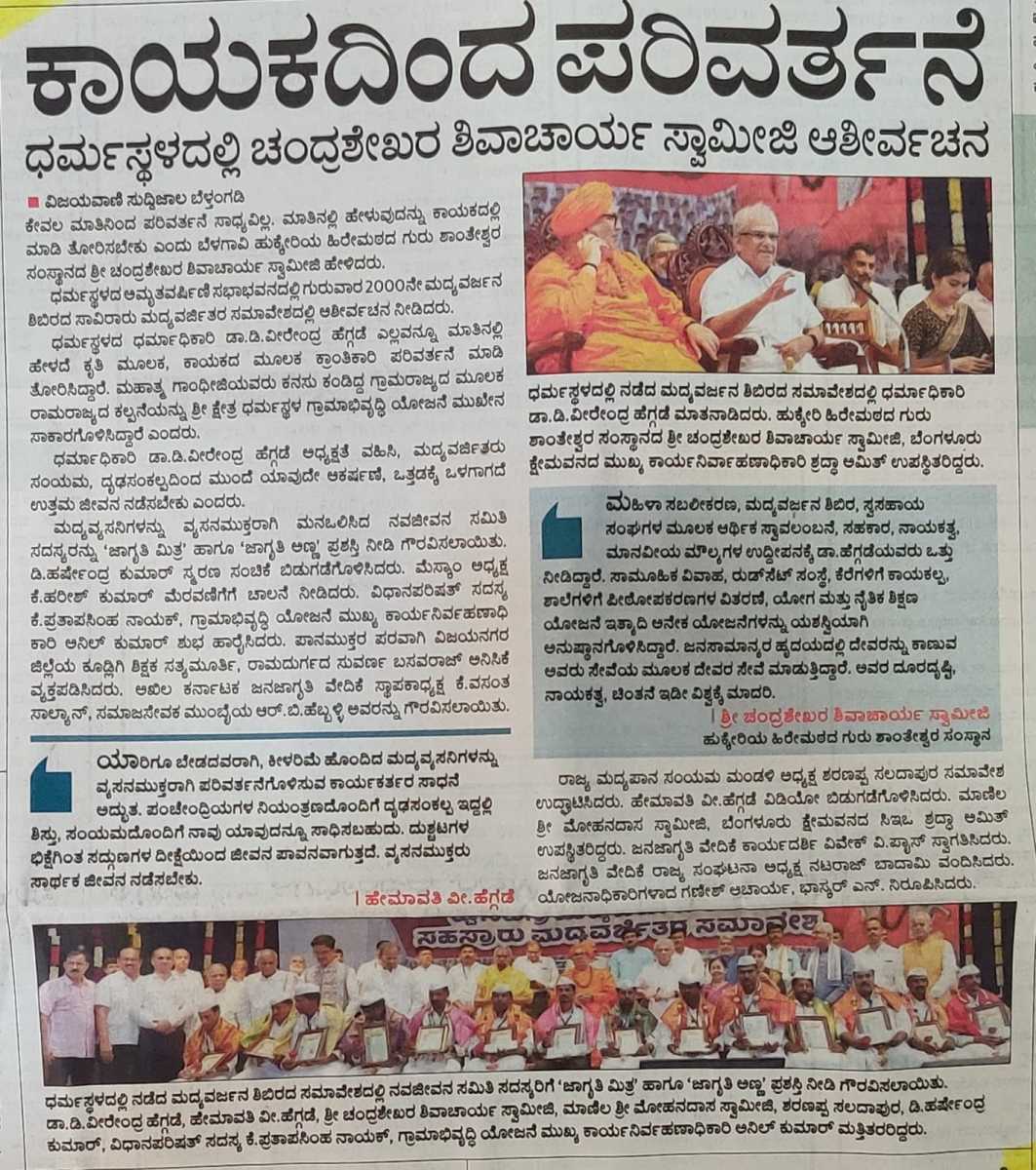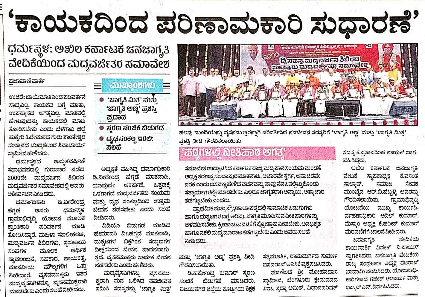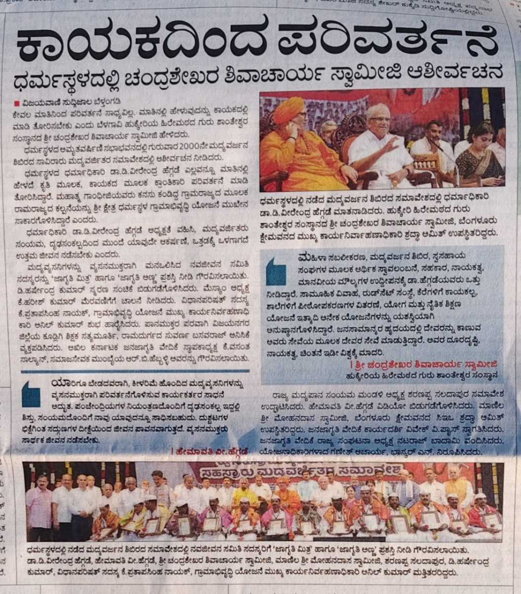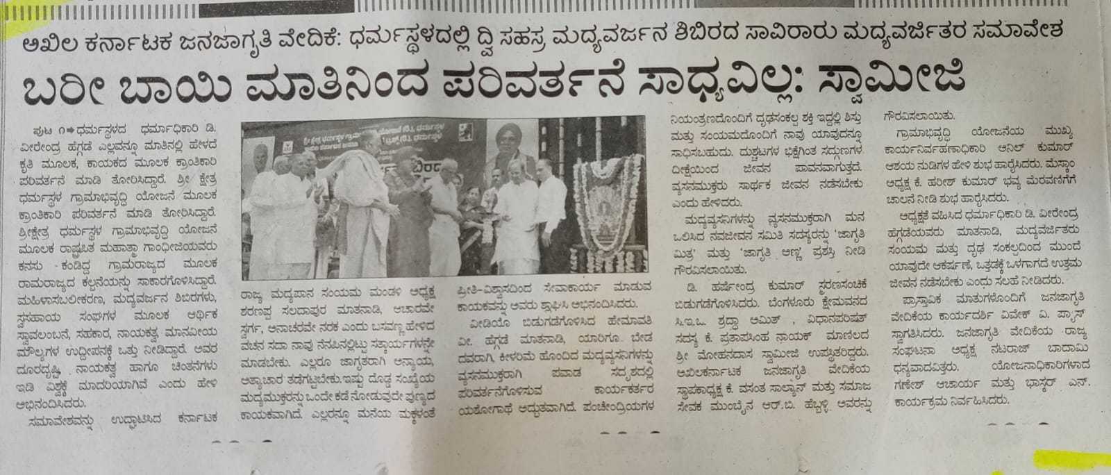 Iam very glad that Janajagruthi Vedike is successfully completing 25 years. It is a sign of progress that this Forum started in 1991 to eradicate bad habits like addiction to liquor has spread throughout the state. Many people joined hands for this purpose and that is how the Forum could achieve this. The path that the Forum has trodden is hard.