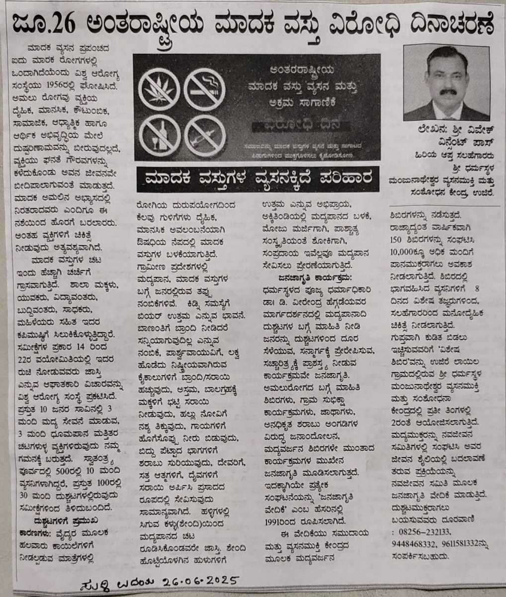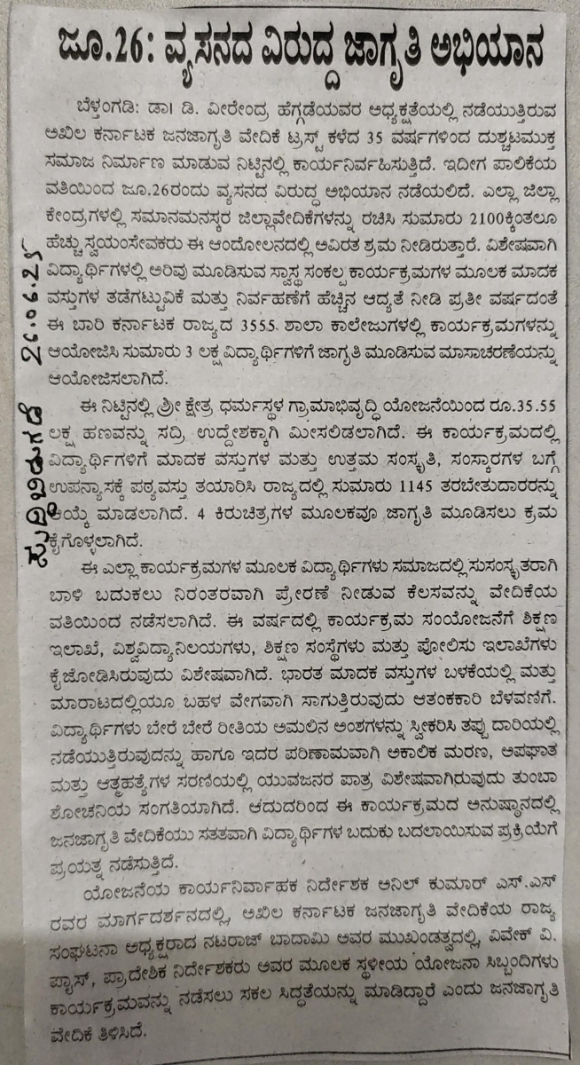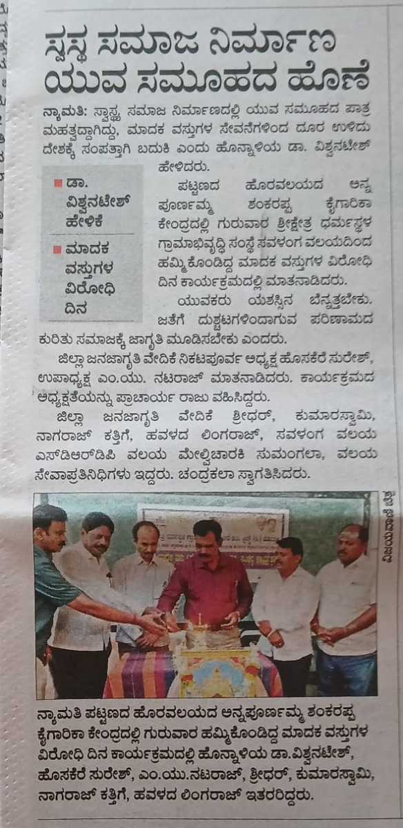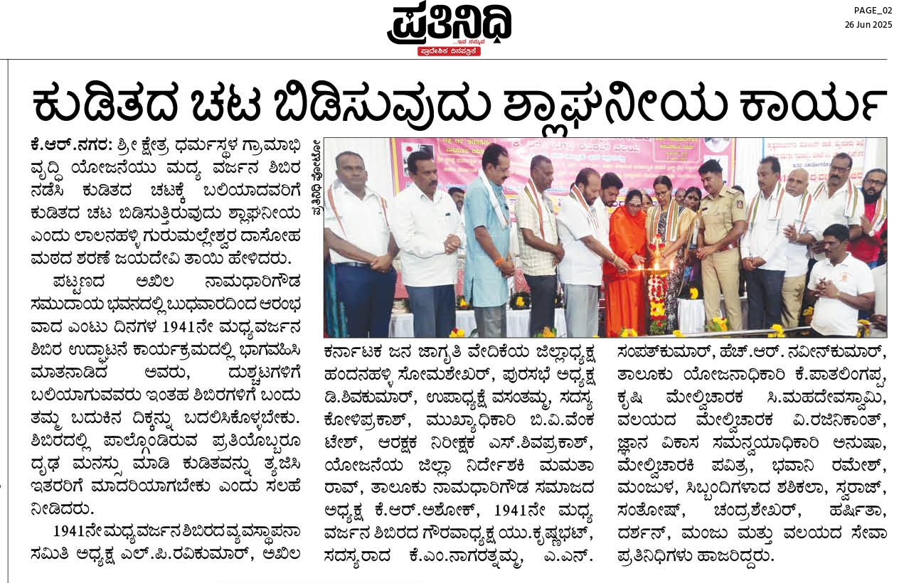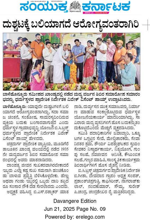 Iam very glad that Janajagruthi Vedike is successfully completing 25 years. It is a sign of progress that this Forum started in 1991 to eradicate bad habits like addiction to liquor has spread throughout the state. Many people joined hands for this purpose and that is how the Forum could achieve this. The path that the Forum has trodden is hard.