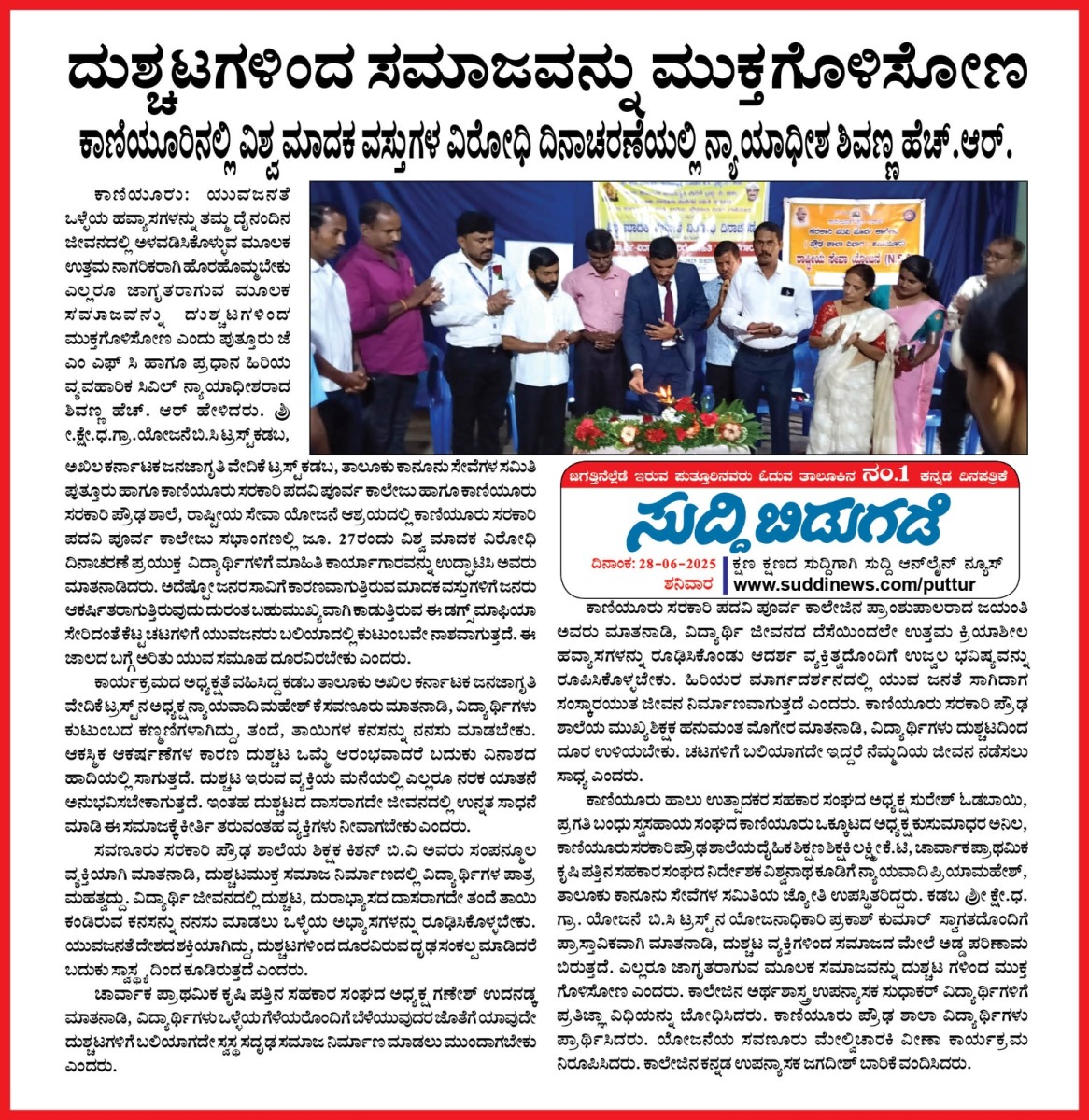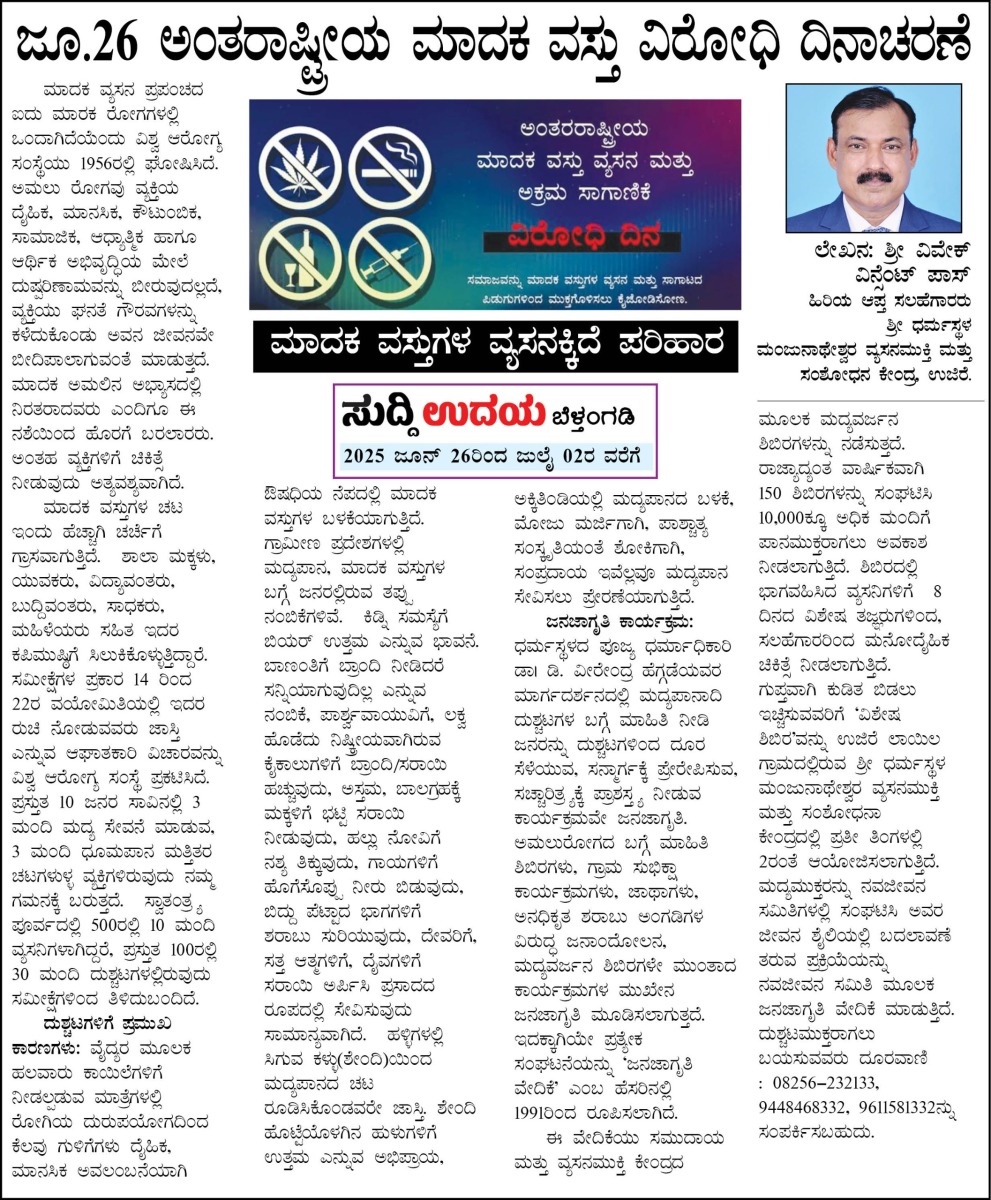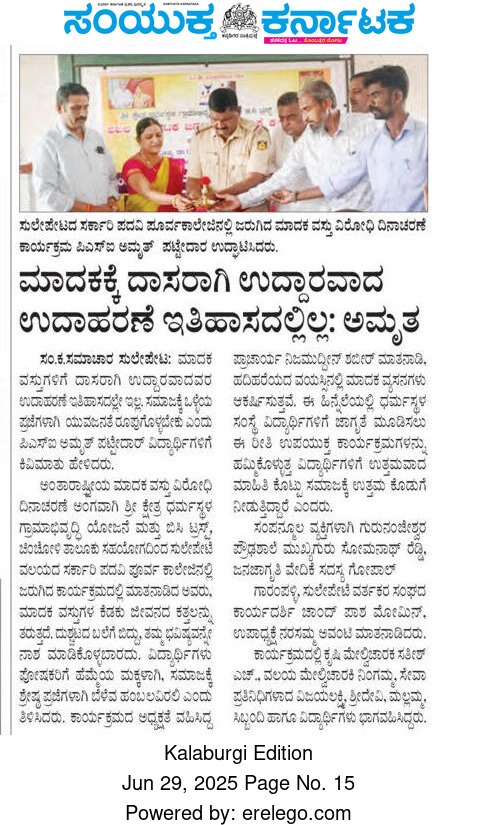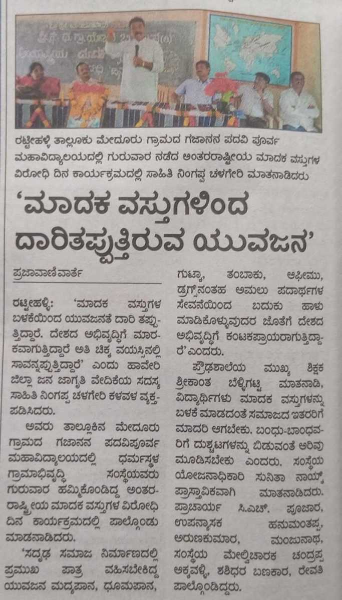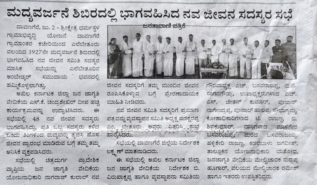Iam very glad that Janajagruthi Vedike is successfully completing 25 years. It is a sign of progress that this Forum started in 1991 to eradicate bad habits like addiction to liquor has spread throughout the state. Many people joined hands for this purpose and that is how the Forum could achieve this. The path that the Forum has trodden is hard.