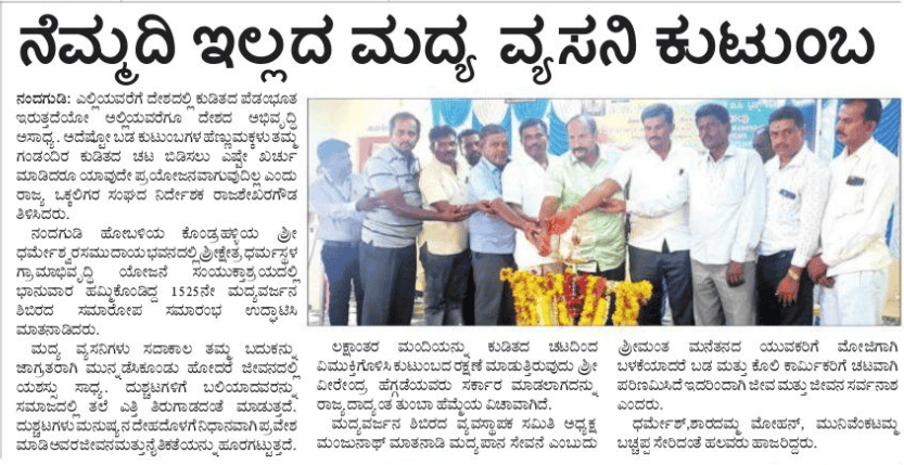 ಬೆಂಗಳೂರು ಪ್ರಾದೇಶಿಕ ವಿಭಾಗದ ಹೊಸಕೋಟೆಯಲ್ಲಿ ನಡೆದ 1525 ನೇ ಮದ್ಯವರ್ಜನ ಶಿಬಿರದಲ್ಲಿ ಭಾಗವಹಿಸಿ ಪಾನಮುಕ್ತರಾದ ಶಿಬಿರಾರ್ಥಿಗಳ ಗುಂಪು