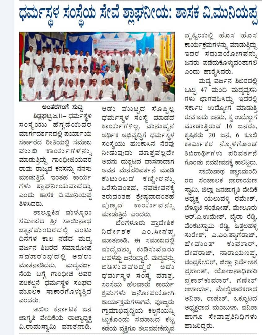 ರಾಮನಗರ ಜಿಲ್ಲೆಯ ಬಿಡದಿ ಯಲ್ಲಿ 1507 ನೇ ಮದ್ಯವರ್ಜನ ಶಿಬಿರದ ಉದ್ಘಾಟನಾ ಸಮಾರಂಭ