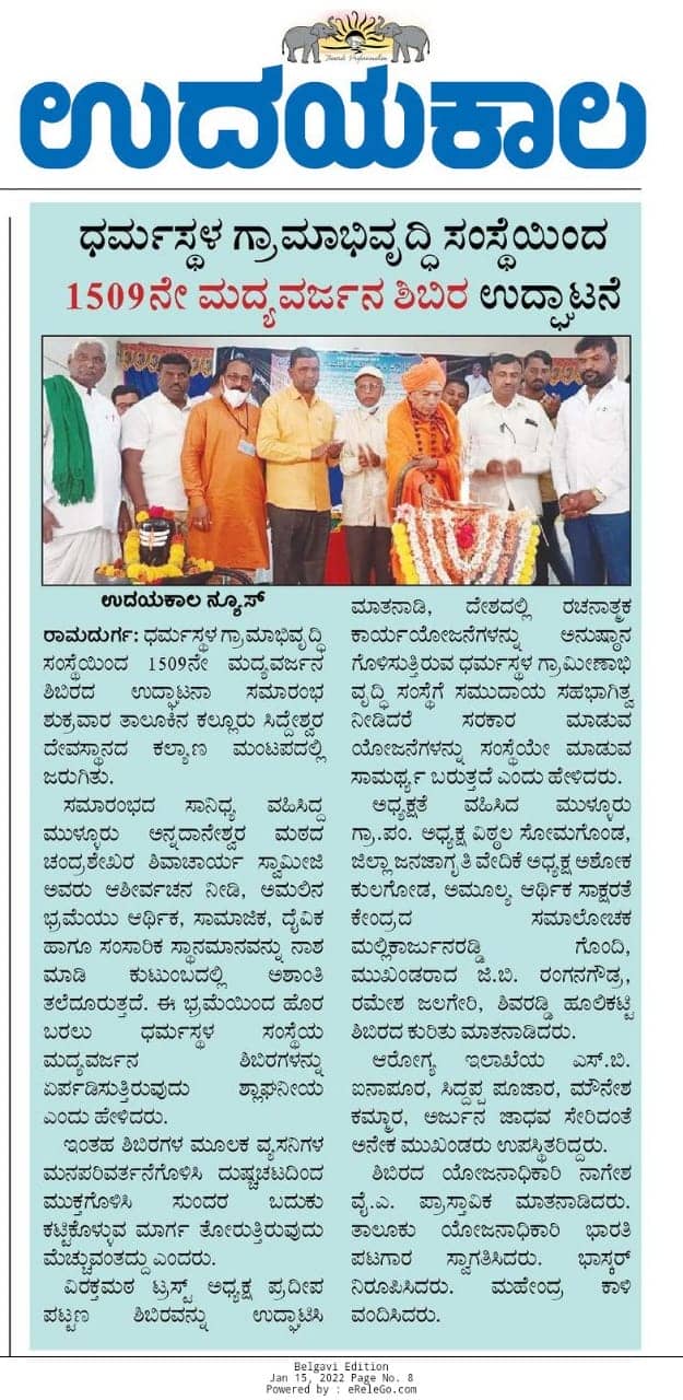 ಧರ್ಮಸ್ಥಳ ಗ್ರಾಮಾಭಿವೃದ್ಧಿ ಯೋಜನೆಯ ವತಿಯಿಂದ ರಾಮದುರ್ಗ ತಾಲೂಕಿನಲ್ಲಿ 1509 ನೇ ಮದ್ಯವರ್ಜನ ಶಿಬಿರ