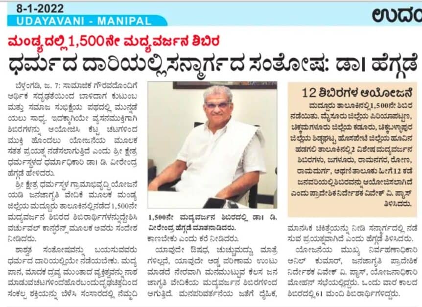 ಮಂಡ್ಯದಲ್ಲಿ 1500 ನೇ ಮದ್ಯವರ್ಜನ ಶಿಬಿರ ಧರ್ಮದ ದಾರಿಯಲ್ಲಿ ಸನ್ಮಾರ್ಗದ ಸಂತೋಷ: ಡಾ || ಹೆಗ್ಗಡೆ