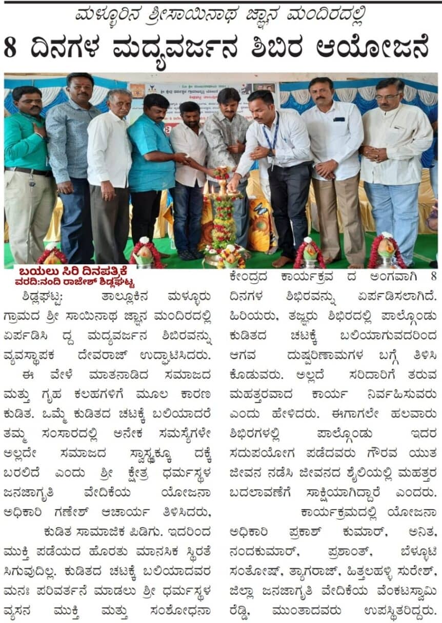 ಶಿಡ್ಲಘಟ್ಟ ತಾಲೂಕಿನ ಮಳ್ಳೂರು ಗ್ರಾಮದಲ್ಲಿ 1503 ನೇ ಮದ್ಯವರ್ಜನ ಶಿಬಿರ
