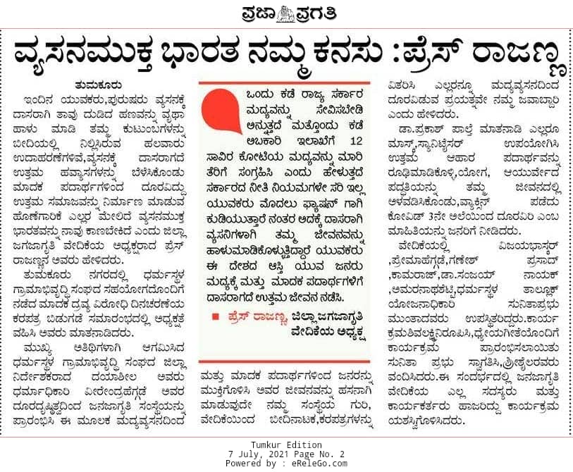 ವ್ಯಸನಮುಕ್ತ ಭಾರತ ನಮ್ಮ ಕನಸು: ಪ್ರೆಸ್ ರಾಜಣ್ಣ