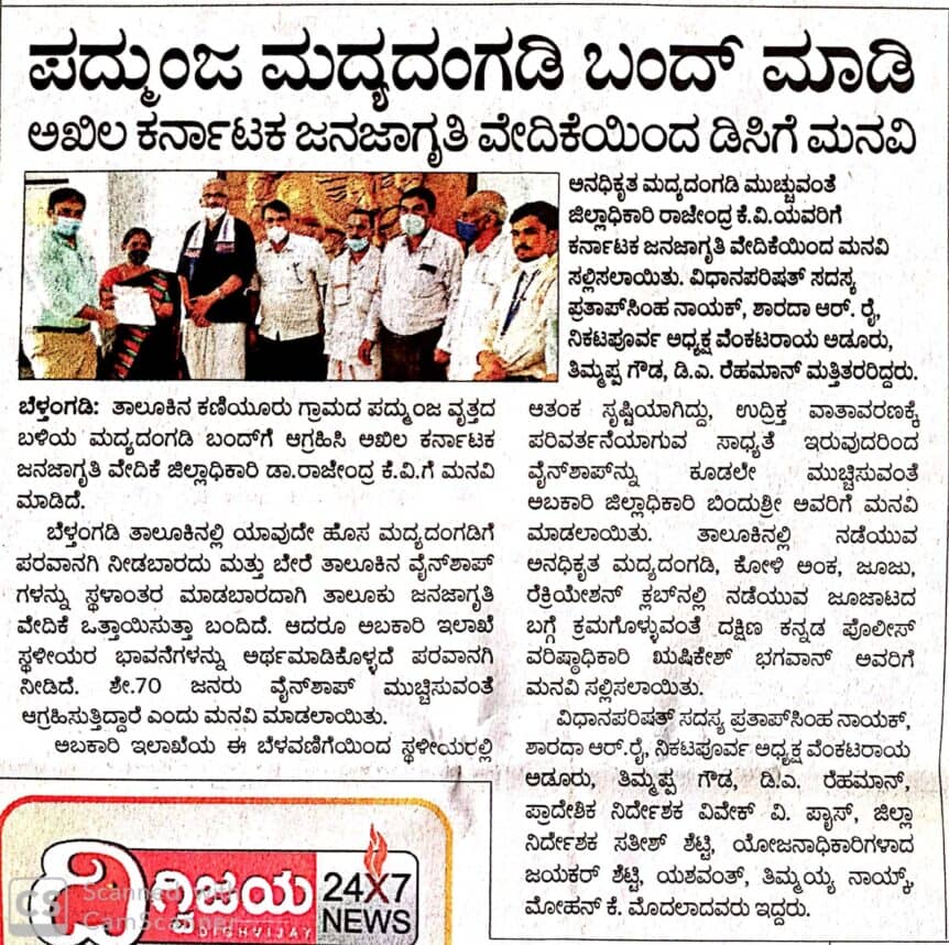 ಪದ್ಮುಂಜ ಮದ್ಯದಂಗಡಿ ಬಂದ್ ಮಾಡಿ : ಅಖಿಲ ಕರ್ನಾಟಕ ಜನಜಾಗೃತಿ ವೇದಿಕೆಯಿಂದ ಡಿಸಿಗೆ ಮನವಿ.