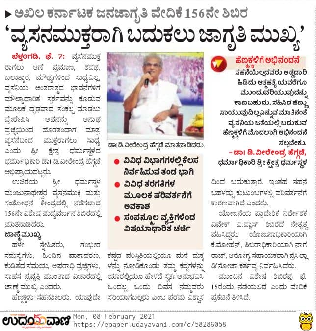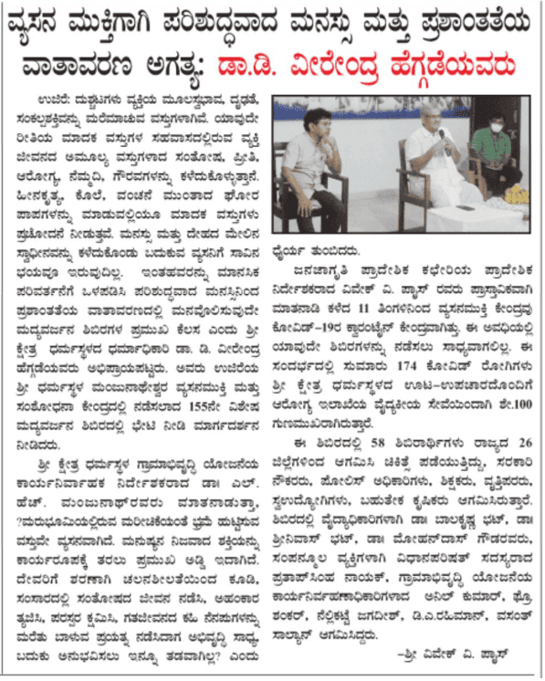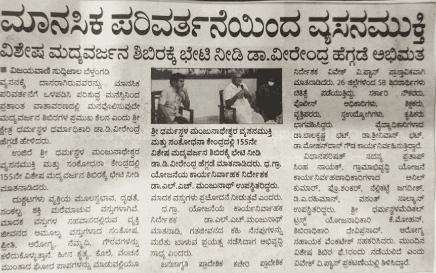 • ವ್ಯಸನಮುಕ್ತರ ಸಮ್ಮಿಲನ ಮತ್ತು ಶತದಿನೋತ್ಸವ ಕಾರ್ಯಕ್ರಮದಲ್ಲಿ ಸಾಧಕ ನವಜೀವನ ಸದಸ್ಯರಿಗೆ ಜಾಗೃತಿ ಅಣ್ಣ-ಮಿತ್ರ ಪ್ರಶಸ್ತಿ ಪ್ರದಾನ