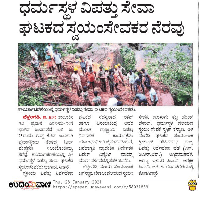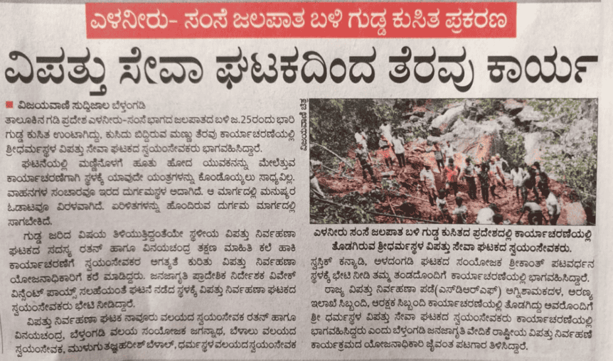 ಗುಡ್ಡ ಕುಸಿತ ತೆರವು ಕಾರ್ಯಾಚರಣೆಯಲ್ಲಿ ಧರ್ಮಸ್ಥಳ ವಿಪತ್ತು ಸೇವಾ ಘಟಕದ ಸ್ವಯಂ ಸೇವಕರ ನೆರವು