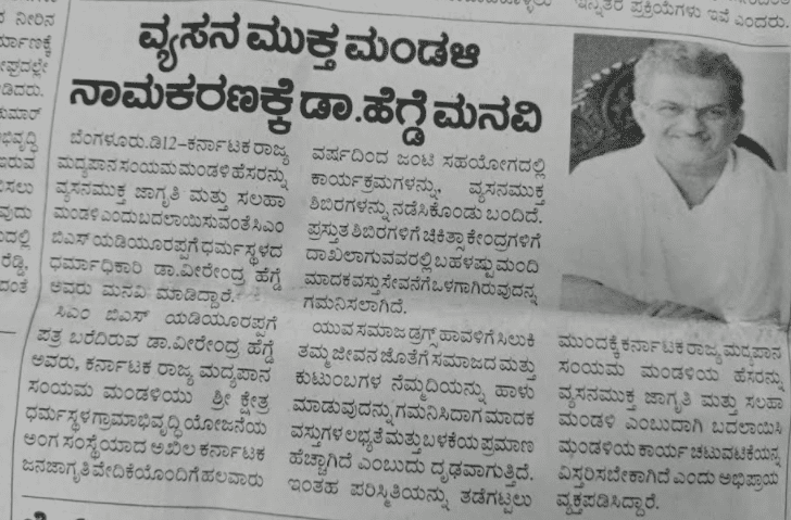 ವ್ಯಸನಮುಕ್ತ ಮಂಡಳಿ ನಾಮಕರಣಕ್ಕೆ ಡಾ . ಹೆಗ್ಡೆ ಮನವಿ