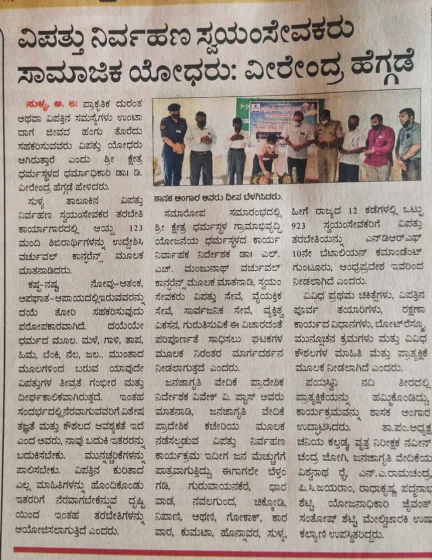 ವಿಪತ್ತು ನಿರ್ವಹಣಾ ಸ್ವಯಂ ಸೇವಕರು ಸಾಮಾಜಿಕ ಯೋಧರು: ವೀರೇಂದ್ರ ಹೆಗ್ಗಡೆ